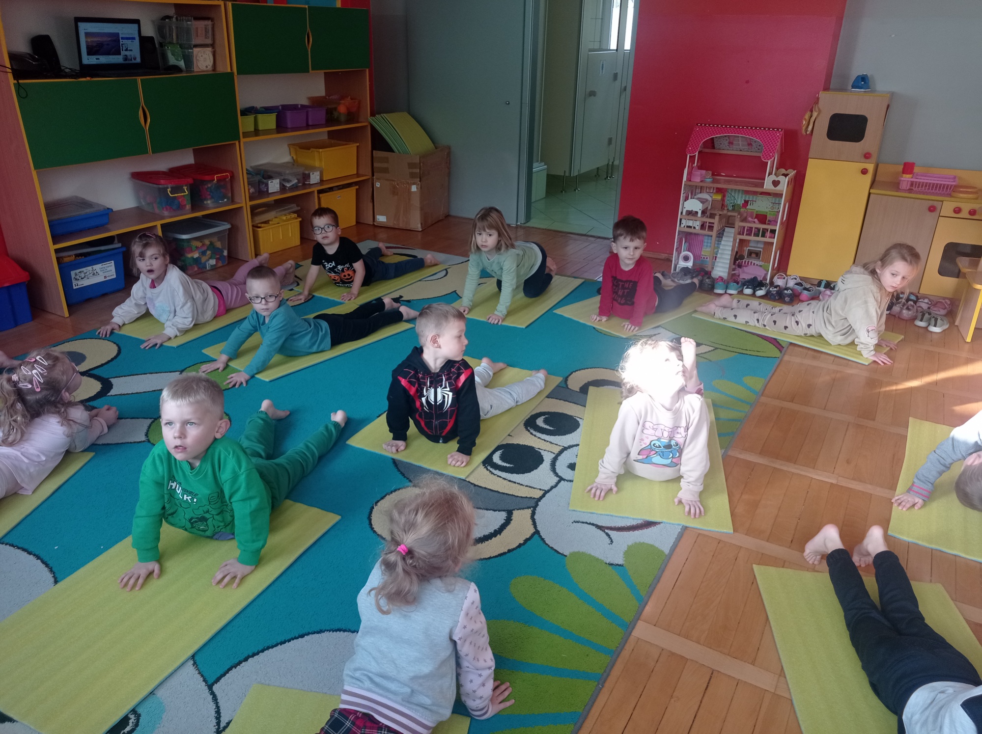 W listopadzie dzieci z grupy „Jeżyki” w ramach zajęć „Baw się z nami emocjami” poznały kilka pozycji jogi . Dzieci wysłuchały jogowego opowiadania „Jesienne przygotowania do zimy” i z pomocą kart z pozycjami wykonały kilka ćwiczeń zgodnie z instrukcją. Przedszkolaki uczestniczyły również w zabawie relaksacyjnej wg. Anny Polender na temat „Relaksacja zmęczonego misia”. Podczas słuchania opowiadania dzieci znajdowały się w pozycji leżącej. Ćwiczenia te miały na celu rozluźnianie mięśni, zniesienia lęków i napięć wewnętrznych dając spokój i wyciszenie. Na zakończenie zajęć wykonaliśmy rundkę, czyli wszystkie dzieci odpowiedziały na pytanie : „Co mi się podobało, a co nie podobało na zajęciach” .